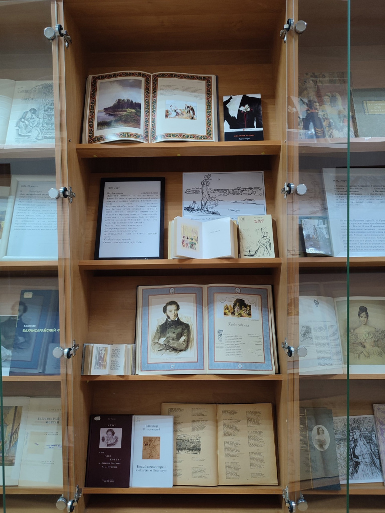 На выставке — издания «Евгения Онегина» с иллюстрациями М. Добужинского, Н. Кузьмина, О. Коровина, последние издания романа.